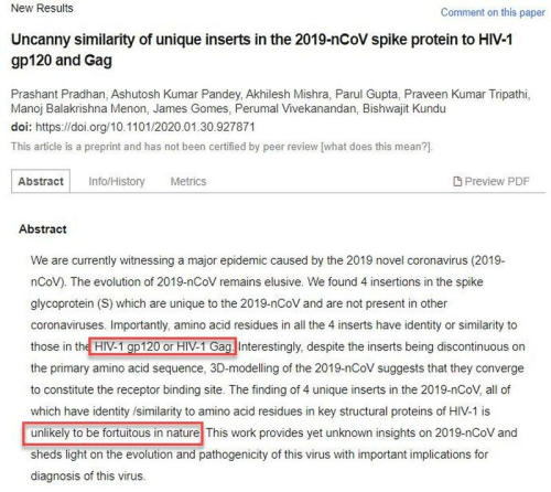 For those pressed for time, here are the key findings from the paper, which first focuses on the unique nature of 2019-nCoV, and then observe four amino acid sequences in the Wuhan Coronavirus which are homologous to amino acid sequences in HIV1: